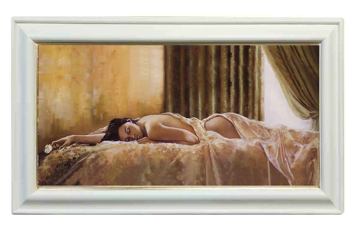 Картина выполнена на холсте, с эффектом живописи, в раме из натурального дерева ручной работы. В оформлении использовано сусальное золото.
