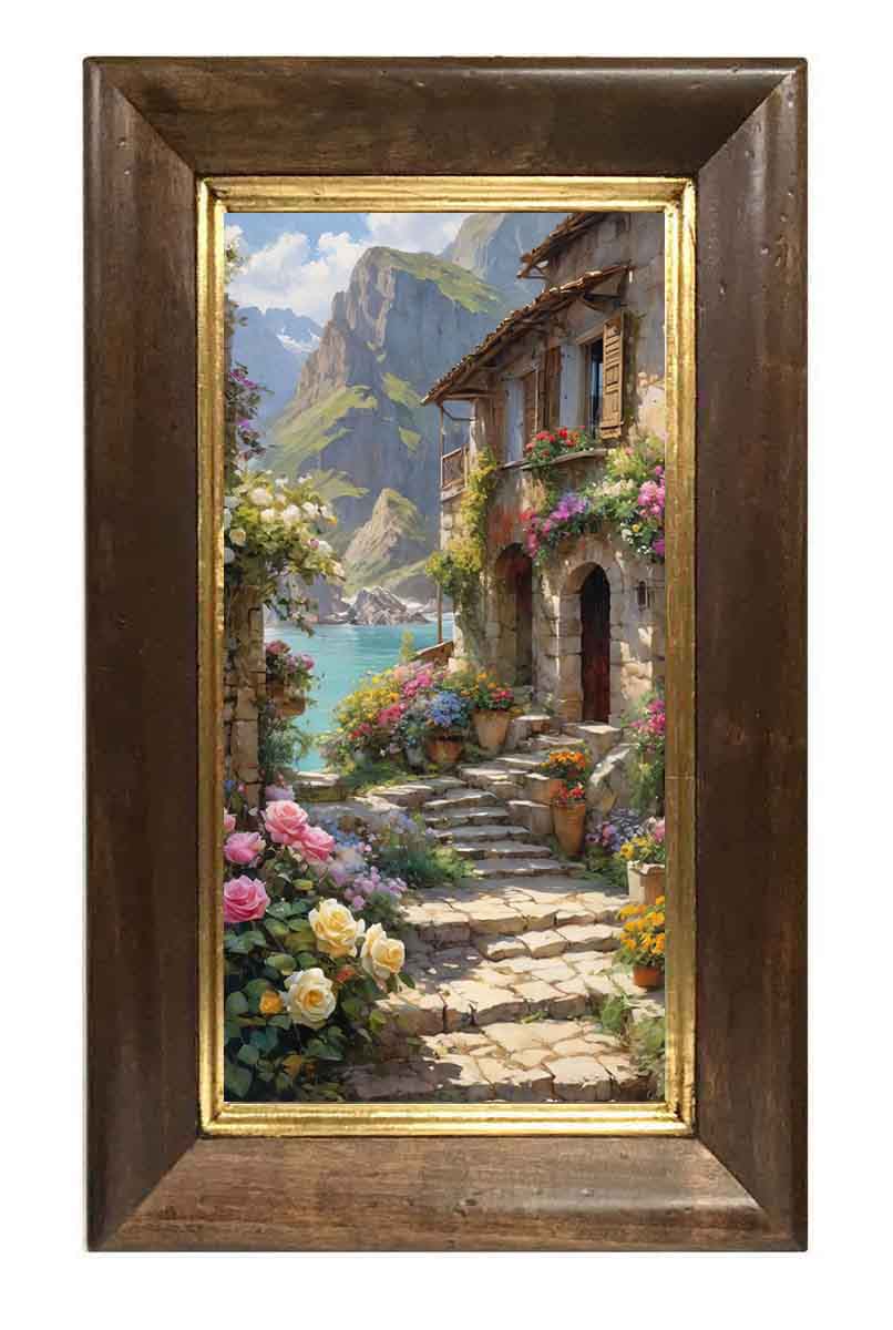 Картина выполнена на холсте с эффектом живописи, в раме из натурального дерева ручной работы, в оформлении использовано сусальное золото.