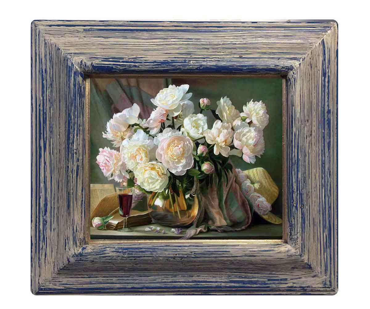 Картина выполнена на холсте с эффектом живописи, в раме из натурального дерева ручной работы. В оформлении использовано сусальное золото.