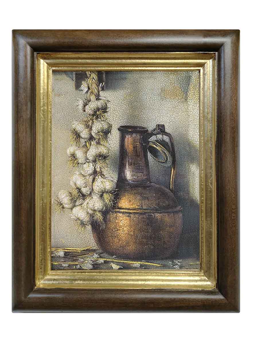 Картина выполнена на холсте, с эффектом живописи, в раме из натурального дерева ручной работы, в оформлении использовано сусальное золото.