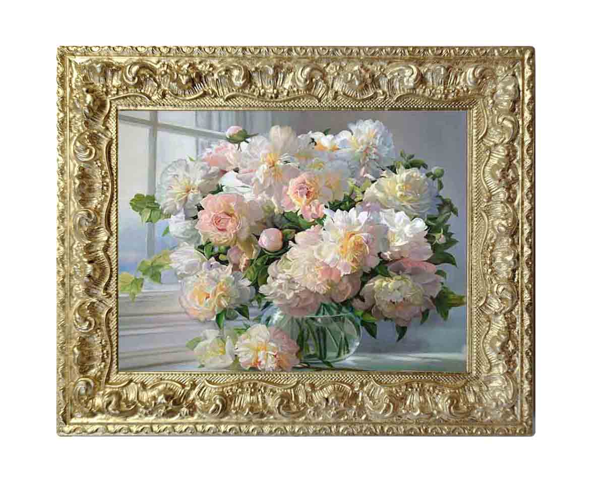 Картина выполнена на холсте с эффектом живописи, в раме из натурального дерева ручной работы. В оформлении использовано сусальное золото.