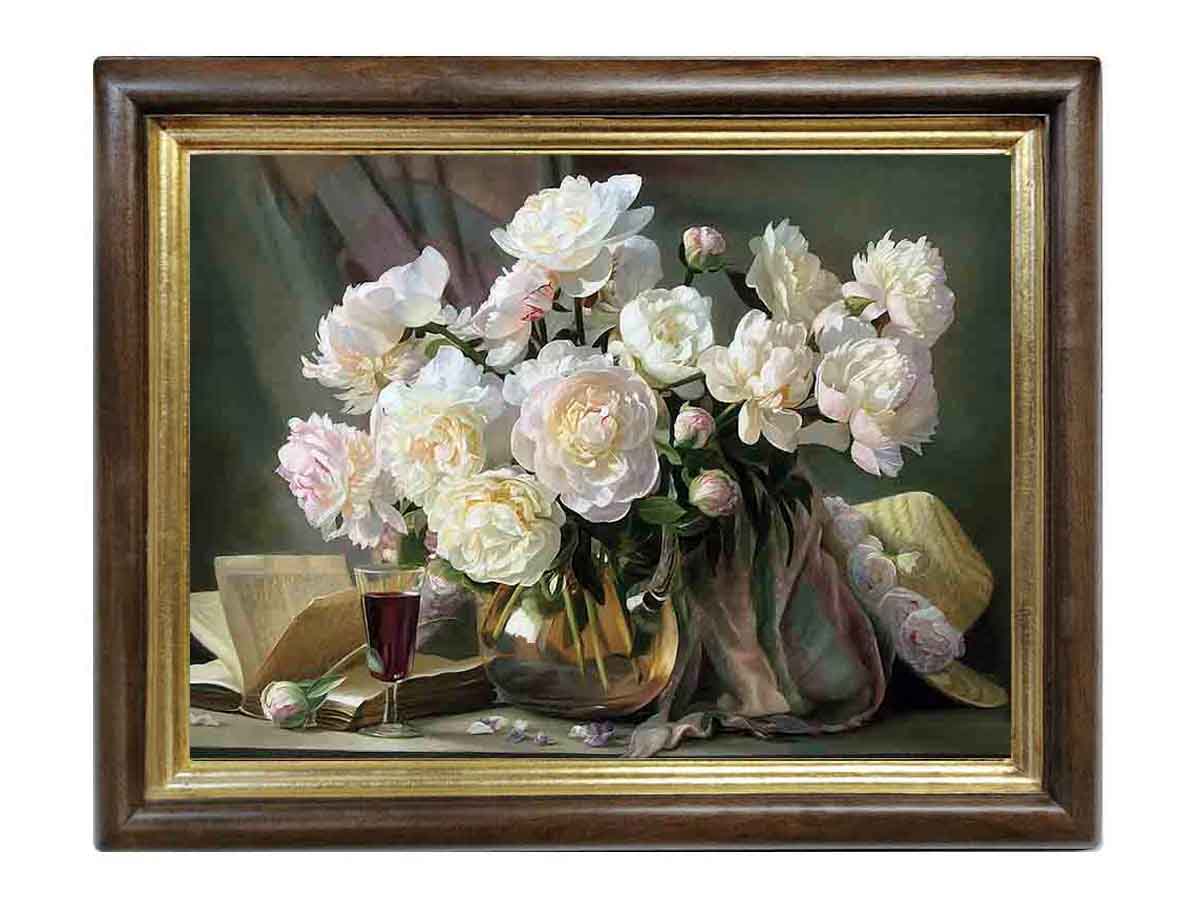 Картина выполнена на холсте в раме из натурального дерева, ручной работы. В оформлении использовано сусальное золото.