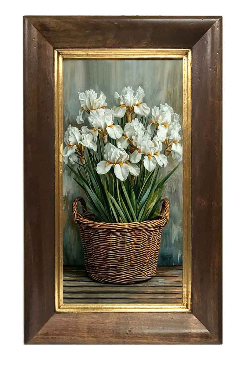 Картина выполнена на холсте с эффектом живописи, в раме из натурального дерева ручной работы, в оформлении использовано сусальное золото.