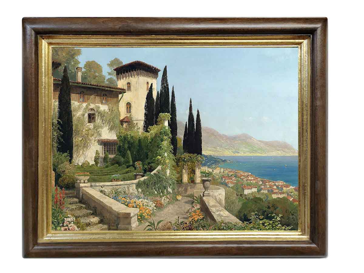 Картина выполнена на холсте в раме из натурального дерева, ручной работы. В оформлении использовано сусальное золото.