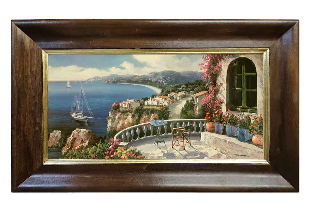Картина выполнена на холсте, с эффектом живописи, в раме из натурального дерева ручной работы. В оформлении использовано сусальное золото.