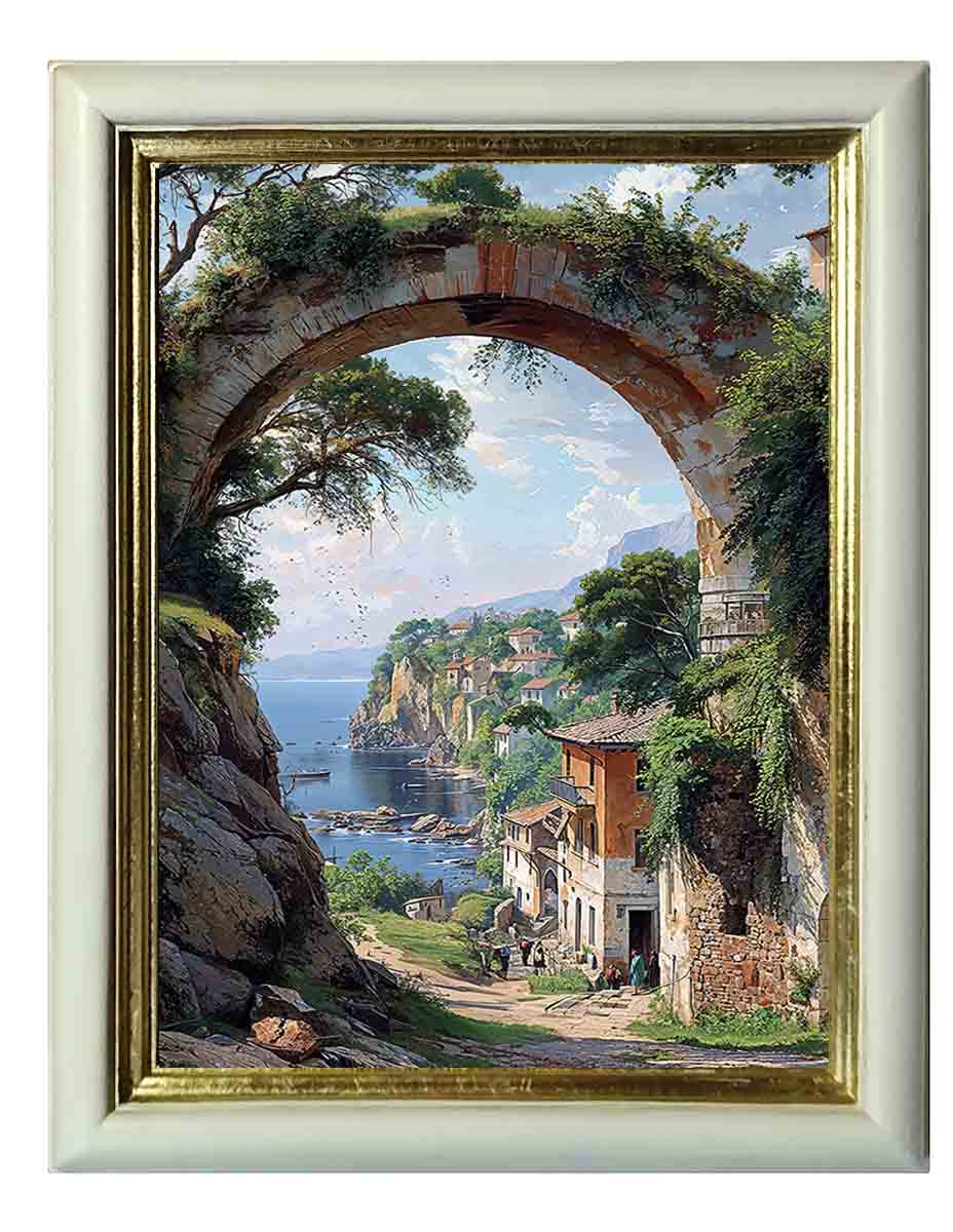 Картина выполнена на холсте, с эффектом живописи, в раме из натурального дерева ручной работы, в оформлении использовано сусальное золото.
