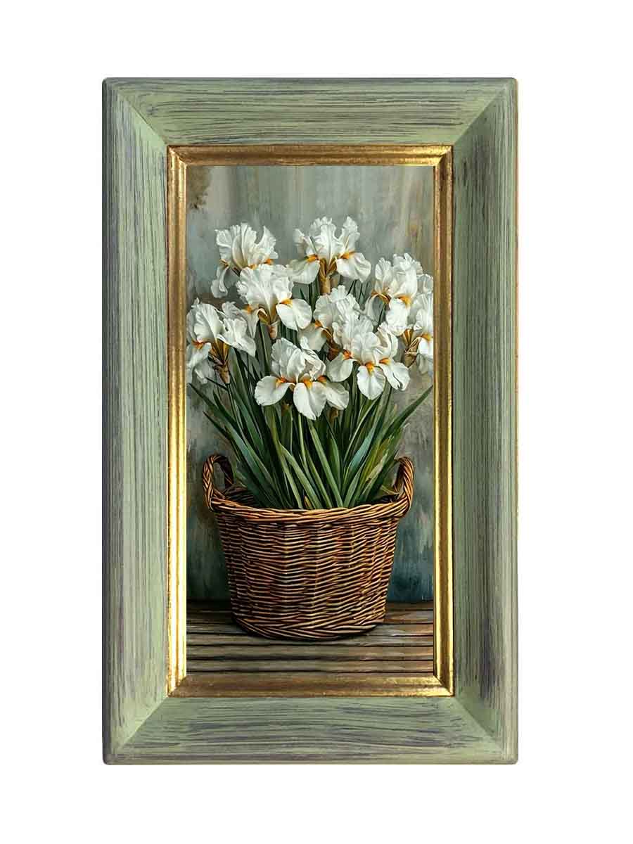 Картина выполнена на холсте, с эффектом живописи, в раме из натурального дерева ручной работы, в оформлении использовано сусальное золото.